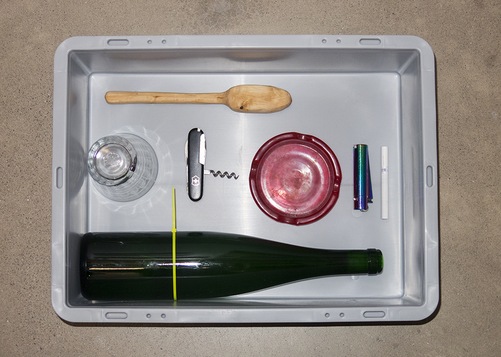 Mixed media installation, plastic box, apple wine, birch spoon, glass, pocket knife, lighter, ash tray, 2023.